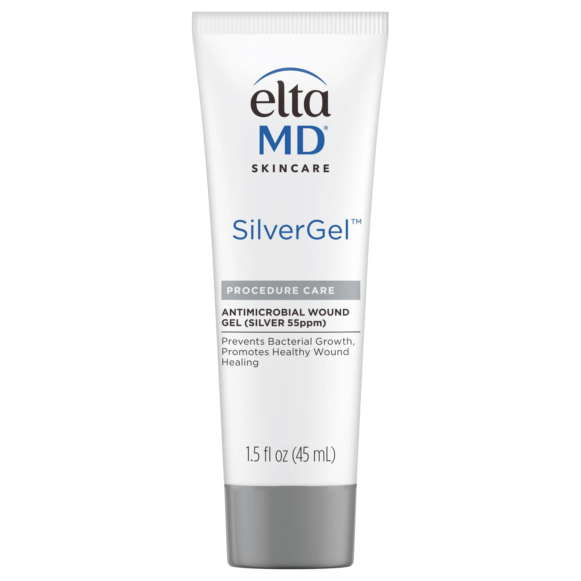 EltaMD SilverGel™ Wound Gel is a medical device for OTC (Over The Counter) use on abrasions, superficial cuts, lacerations, and minor irritations of the skin. Under supervision of a medical professional, it is indicated for use on sites where infection exists or threatens including surgical wounds, 1st and 2nd degree burns, grafted wounds, skin tears, donor sites and various skin ulcers. (net 1.5 fl oz/45 mL)