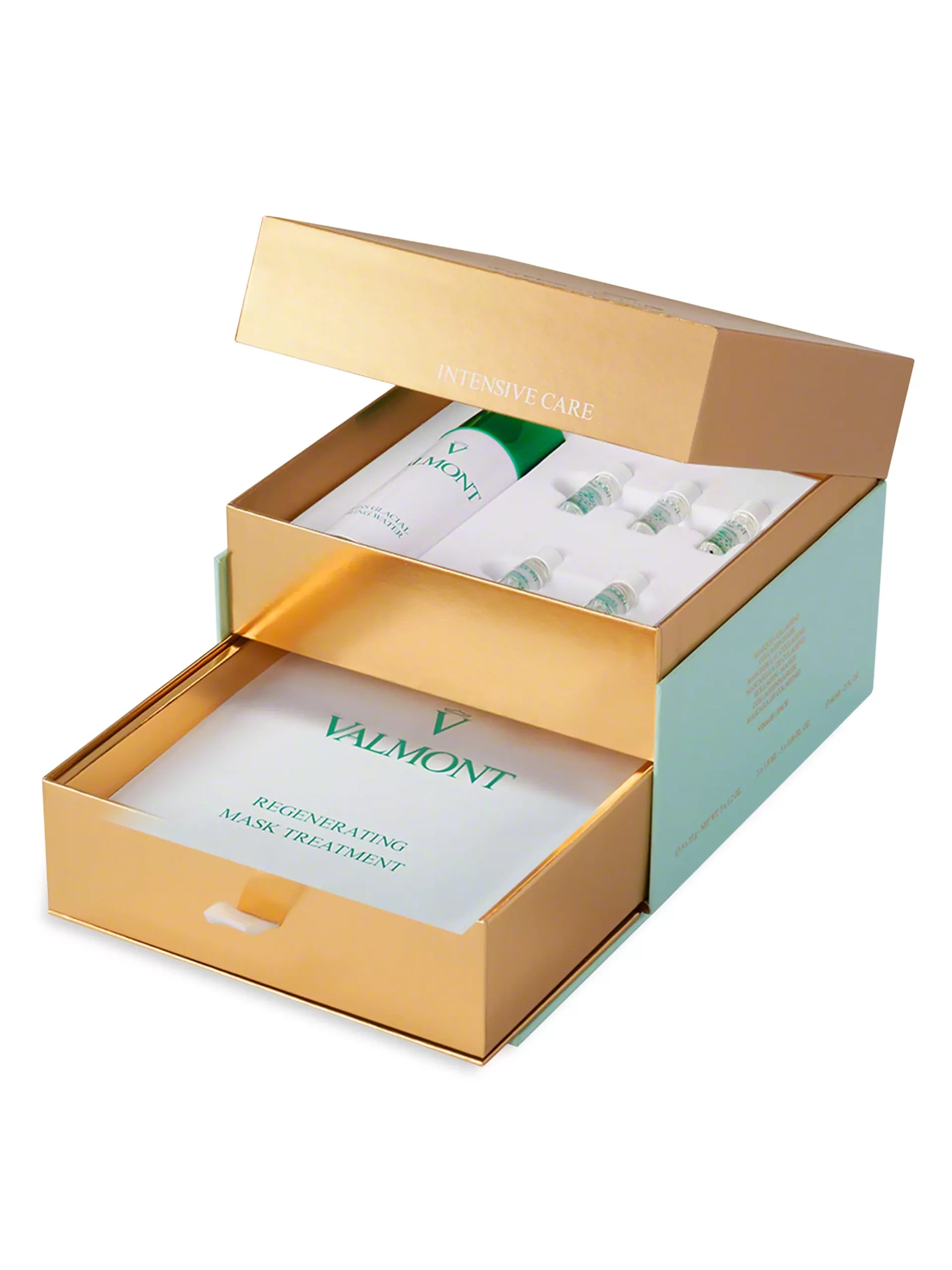 Spray Swiss Glacial Sprint Water onto thoroughly cleansed face. Peel the collagen mask off its plastic backing. Hold the mask at eye level and gently stretch it to cover the sides of the face. Eliminate air bubbles. Leave on for 30 minutes, then remove and apply the vial of Collagen Post Treatment. Follow with your favorite Valmont serum and cream. For occasional use, or as an intensive treatment once a week for 5 weeks.